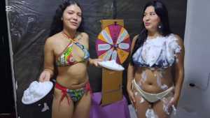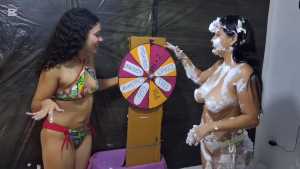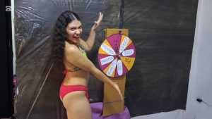 From the moment the wheel starts spinning, the energy is high and the laughter is nonstop. The model bravely takes on each messy challenge, getting covered little by little as cream pies splatter, eggs crack, and each task adds an extra layer of fun.