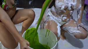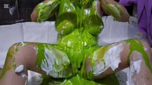 The final challenge on the wheel is the grand finale: a full green-slime shower. After completing all the previous tasks and already being a delightful mess, the model steps into place as a bucket of bright green slime pours over her from head to toe, leaving her laughing along with everyone else.